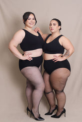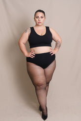 Enfin, un collant qui prend en compte les courbes de la femme ronde, qui ne descend pas le long de l'entrejambe, qui ne coupe pas le ventre, qui ne tourne pas... tout cela sans sacrifier l'élégance.